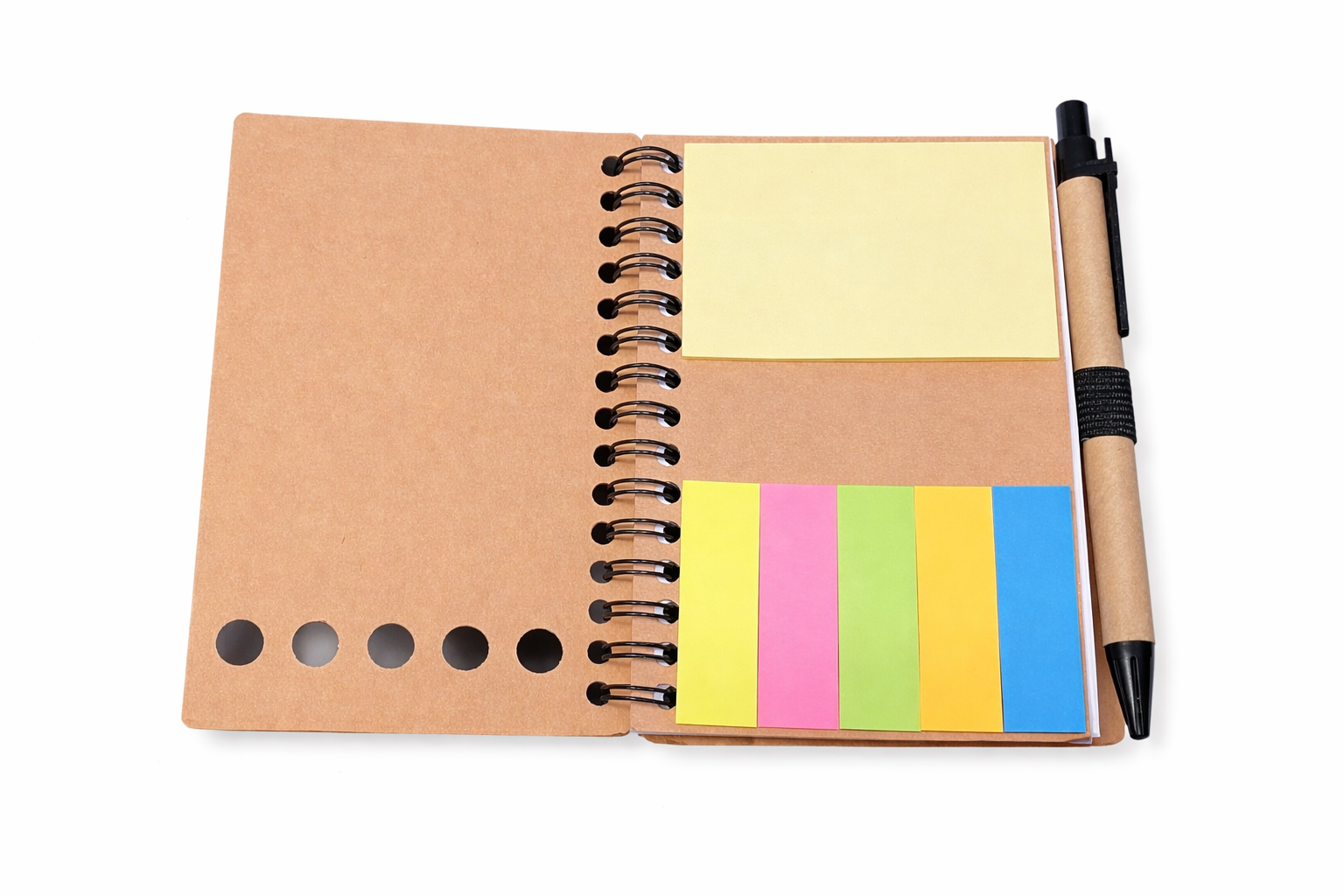 Small lined spiral notepad & pen with sticky notes. 13.5cm x 8.5cm.80 pages, 120gsm lined paper.